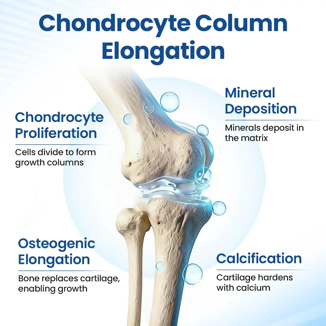 During skeletal development, chondrocytes within the growth plates drive bone elongation by forming organized cellular columns that determine height. Although growth plates gradually close with age, cartilage metabolism, bone remodeling, and spinal elasticity remain active in adulthood.
