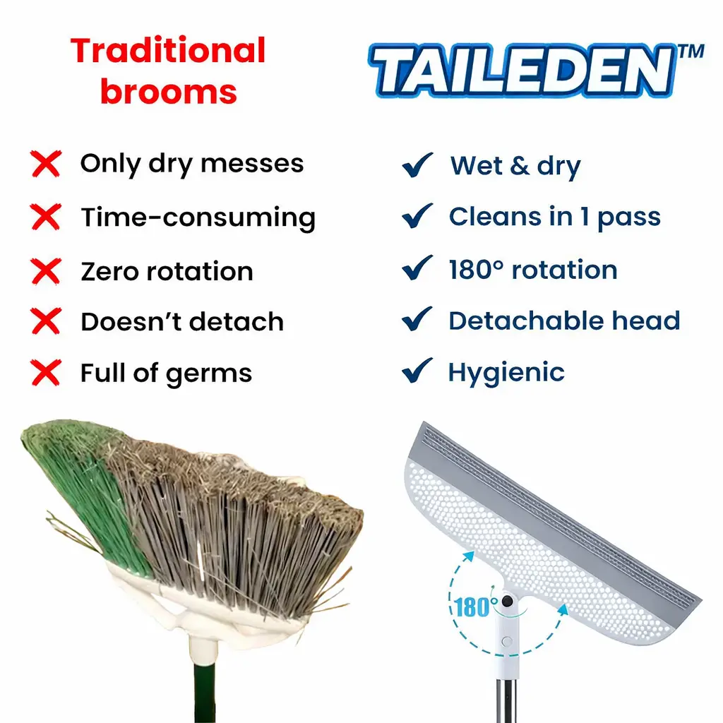 WASHABLE & LONG-LASTING: Unlike traditional bristle brooms, TAILEDEN™ smooth silicone blade doesn’t get tangled with nasty hair and dust bunnies. Just rinse clean after every use—no more dirty, bacteria-laden bristles!